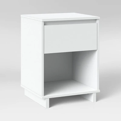 Elevate your sleep space with the simple and chic Modern Nightstand from Room Essentials™. The laminated wood-finish nightstand coordinates easily with any decor style, and it’s complemented by a sleek, rectangular silhouette standing at a height of 25.47 inches with convenient closed and open storage options. This bedside table features a smooth top to house your lamp, a lower drawer to secure your bedside essentials and a bottom open cubby that’s perfect for books and more. A top drawer without a protruding handle leaves a flat, smooth surface you’ll love, further enhancing the minimalist design of the nightstand.