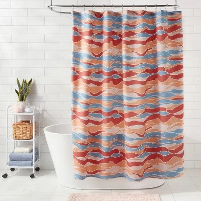 Give your bath space a striking, modern look with this Diverse Artist Series Topography Shower Curtain from Room Essentials™. The decorative shower curtain features a buttonhole top for easy installation and is machine washable for a quick refresh whenever needed. It’s adorned with a vibrant wavy terrain pattern in blue, red, brown, light pink and white hues to beautifully enclose a bathtub or shower stall for added privacy and style.