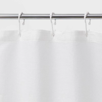 The Solid Shower Curtain from Room Essentials™ will fall gracefully around your bath or shower stall. Featuring dobby construction with a lovely waffle-weave pattern throughout for a touch of subtle texture, this decorative shower curtain is versatile enough to go with any decor style. The machine-washable shower curtain helps prevent water from spilling onto your floors while showering, and it’s finished with a buttonhole top that allows for easy installation.